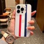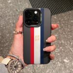 Sophisticated black base with iconic red, white and navy blue vertical stripes featuring gold emblem detail. Luxury fashion for your phone.